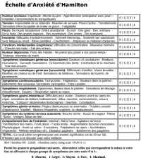 L'échelle HAD, permet de dépister les troubles anxieux et dépressifs. Elle comporte 14 items côtés de 0 à 3. Sept questions se rapportent à l'anxiété (total A) et sept autres à la dimension dépressive (total D), permettant ainsi l'obtention de deux scores (note maximale de chaque score = 21). C'est un questionnaire auto administré [2].