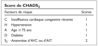 Le score CHADS2 permet une évaluation du risque thromboembolique du patient présentant une FA non valvulaire. 1 point est accordé à chacun des paramètres suivants : âge ≥ 75 ans, insuffisance cardiaque congestive, hypertension artérielle, diabète sucré. 2 points sont notés pour un antécédent d’accident cérébral thromboembolique [2, 3].